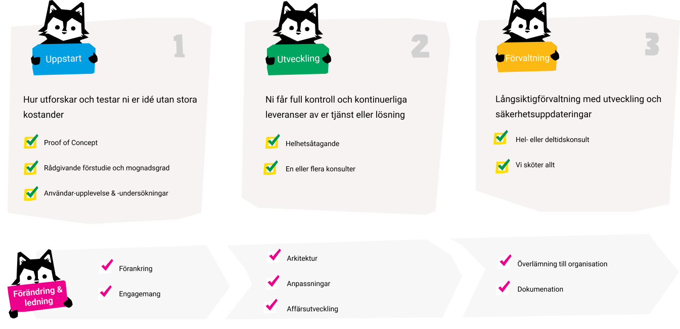 Vi tror inte på långa projekt där ni behöver riskera er insats och vänta länge innan ni ser resultat. Det vi bygger ska ge ett värde i alla steg, oavsett hur långt vårt samarbete sträcker sig.
